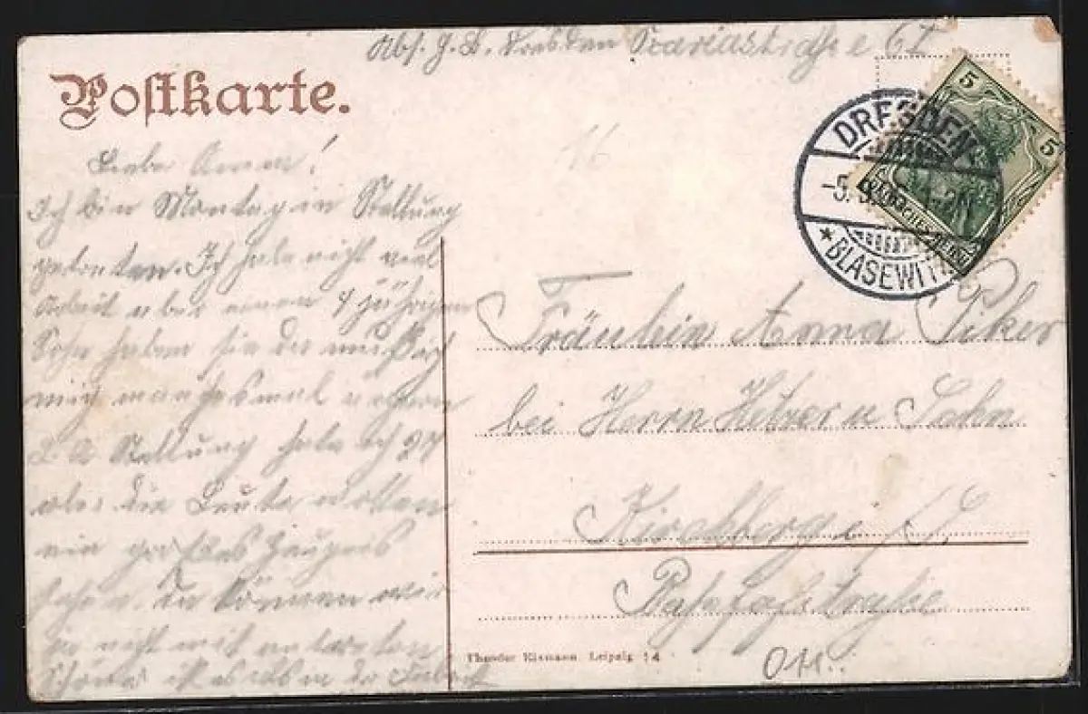 alte Ansichtskarte, gelaufen 1906, Eckknick oben links, Einrisse oben links u. mittig, guter Zustand