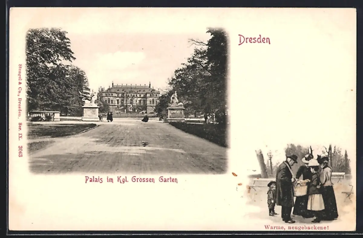 AK Dresden, Palais im Kgl. Grossen Garten, Warme, neugebackene, Verkäufer mit Korb
