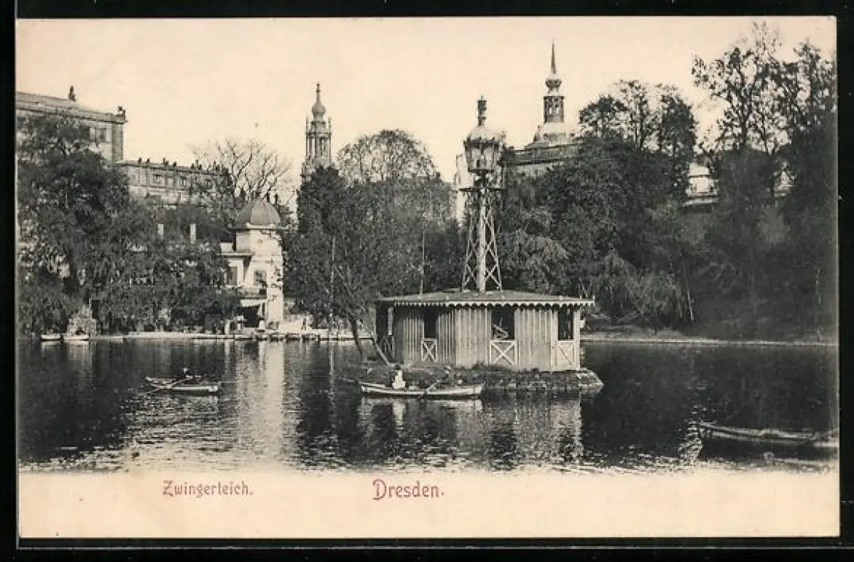 AK Dresden, Partie am Zwingerteich, mit Ruderbooten