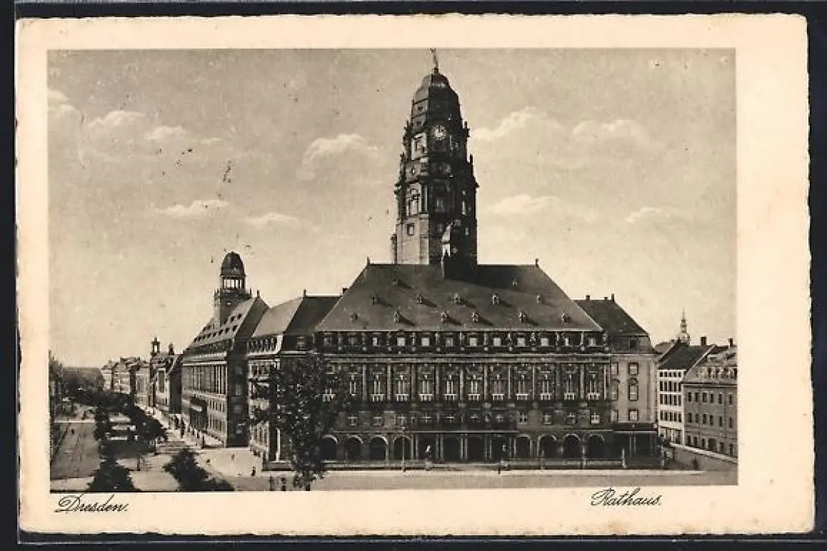 AK Dresden, Rathaus und Strasse aus der Vogelschau