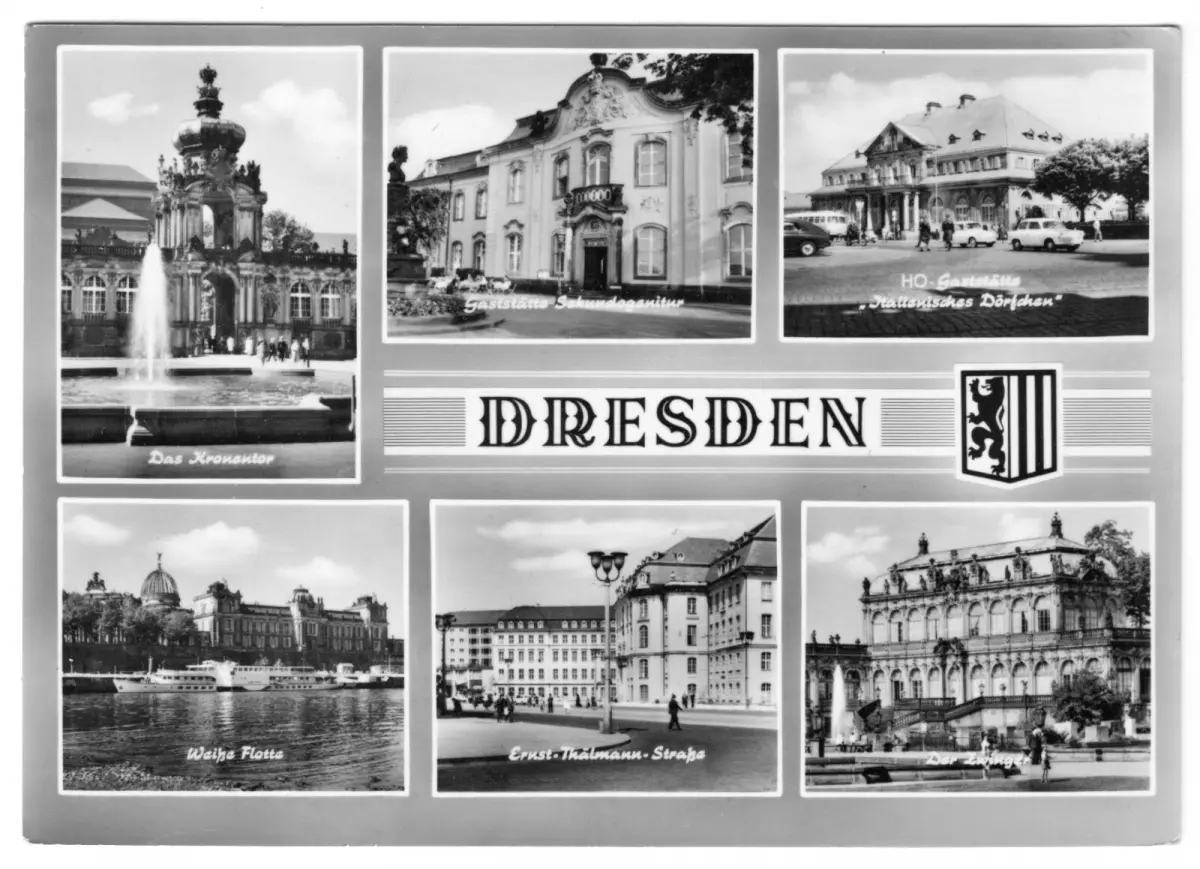 AnsichtskarteDresdensechs Abb., gestaltetKronentor, Gaststätte Secundogenitur, Italienisches Dörfchen, Weiße Flotte, Ernst-Thälmann-Str., Zwinger, Erhaltung I-II, Beförderungsspuren