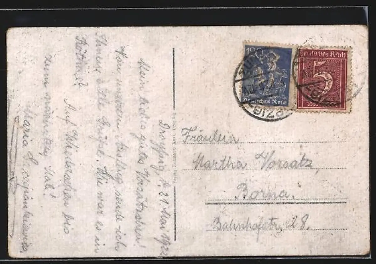alte Ansichtskarte, gelaufen, Abriebspur rechts mittig