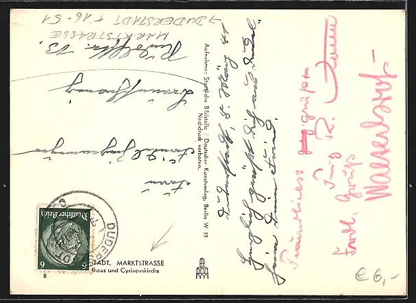 Personenbezogene Daten auf der Rückseite der Karte wurden durch blauen Textmarker unkenntlich gemacht. Die blauen Stellen sind auf die Vorderseite durchgeweicht und wirken sich negativ auf das Postkartenfoto aus