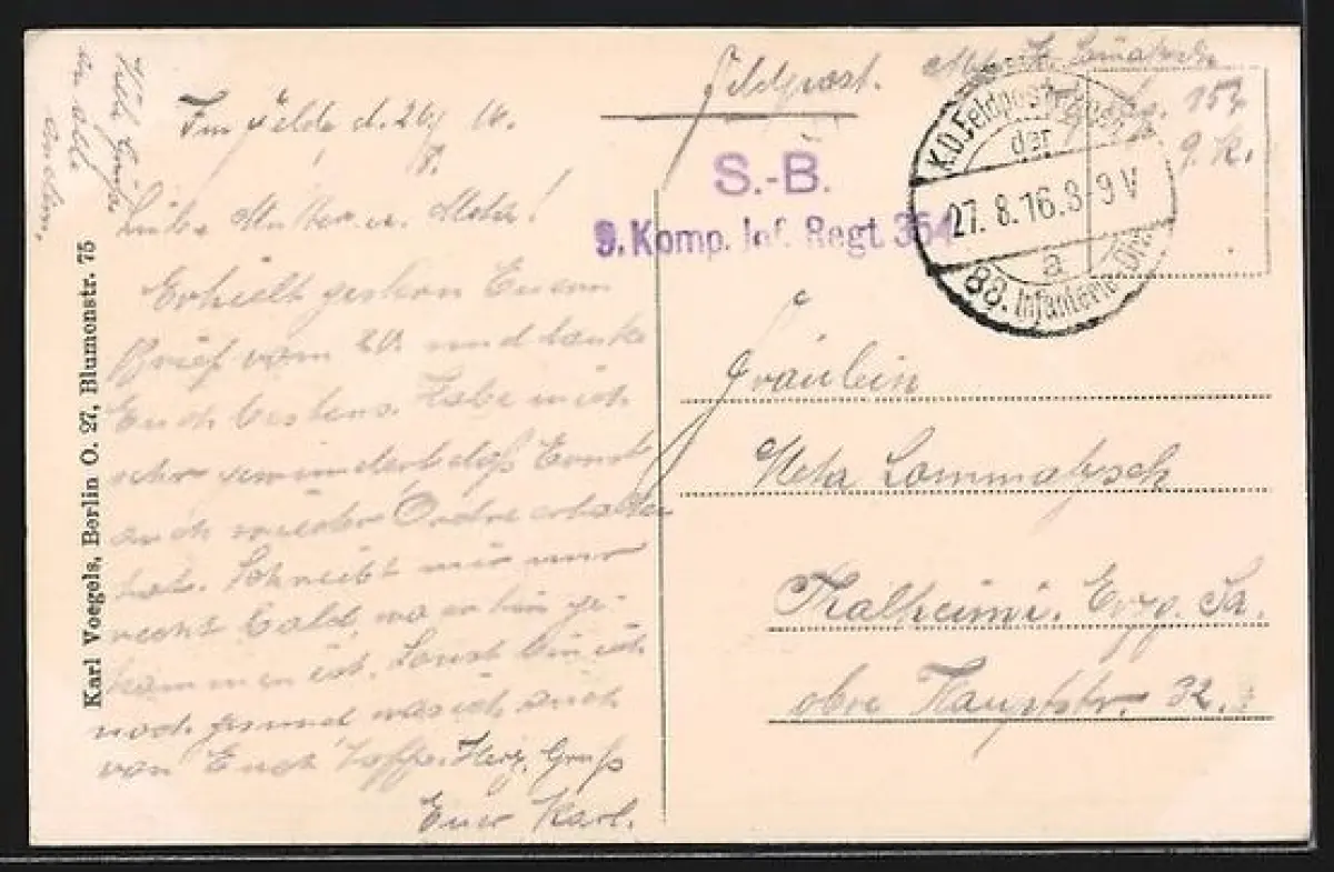 alte Ansichtskarte, gelaufen 1916 als Feldpost, Eckknick links oben, guter Zustand