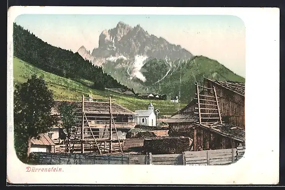AK Dürrenstein, Teilansicht mit Kirche, Berge im Hintergrund