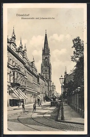 AK Düsseldorf, Blumenstrasse und Johanneskirche, Strassenbahn