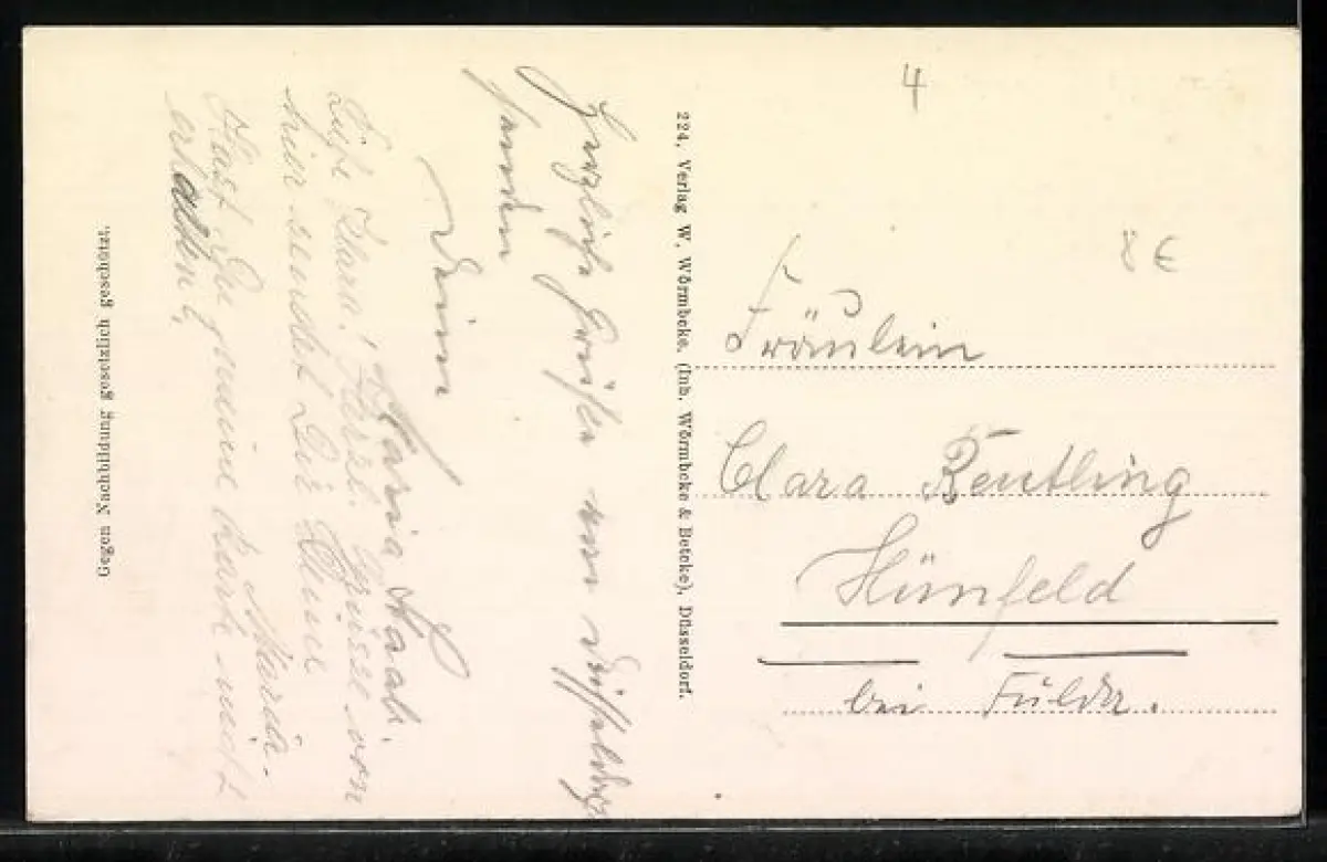 Personenbezogene Daten auf der Rückseite der Karte wurden durch blauen Textmarker unkenntlich gemacht. Die blauen Stellen sind auf die Vorderseite durchgeweicht und wirken sich negativ auf das Postkartenfoto aus