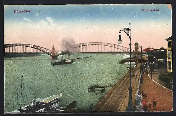 AK Düsseldorf, Rheinansicht mit Brücke und Schiffen