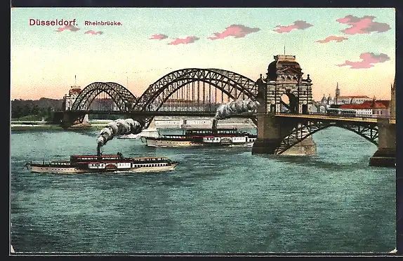 AK Düsseldorf, Rheinbrücke mit Raddampfern