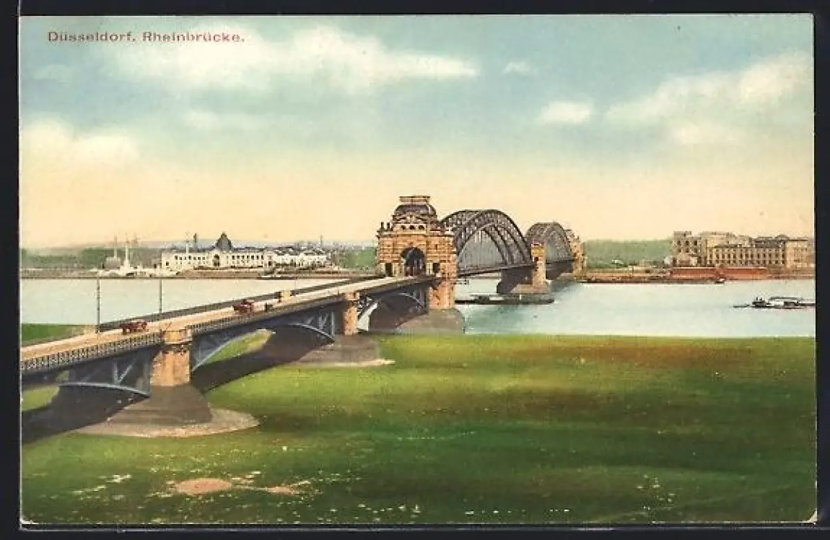 AK Düsseldorf, Rheinbrücke mit Wiesen