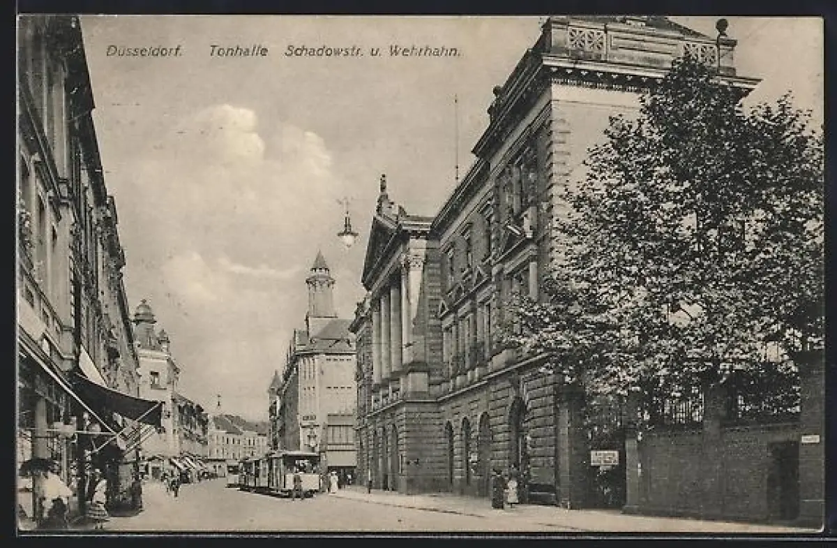 AK Düsseldorf, Tonhalle in der Schadowstrasse und Wehrhahn mit Strassenbahn