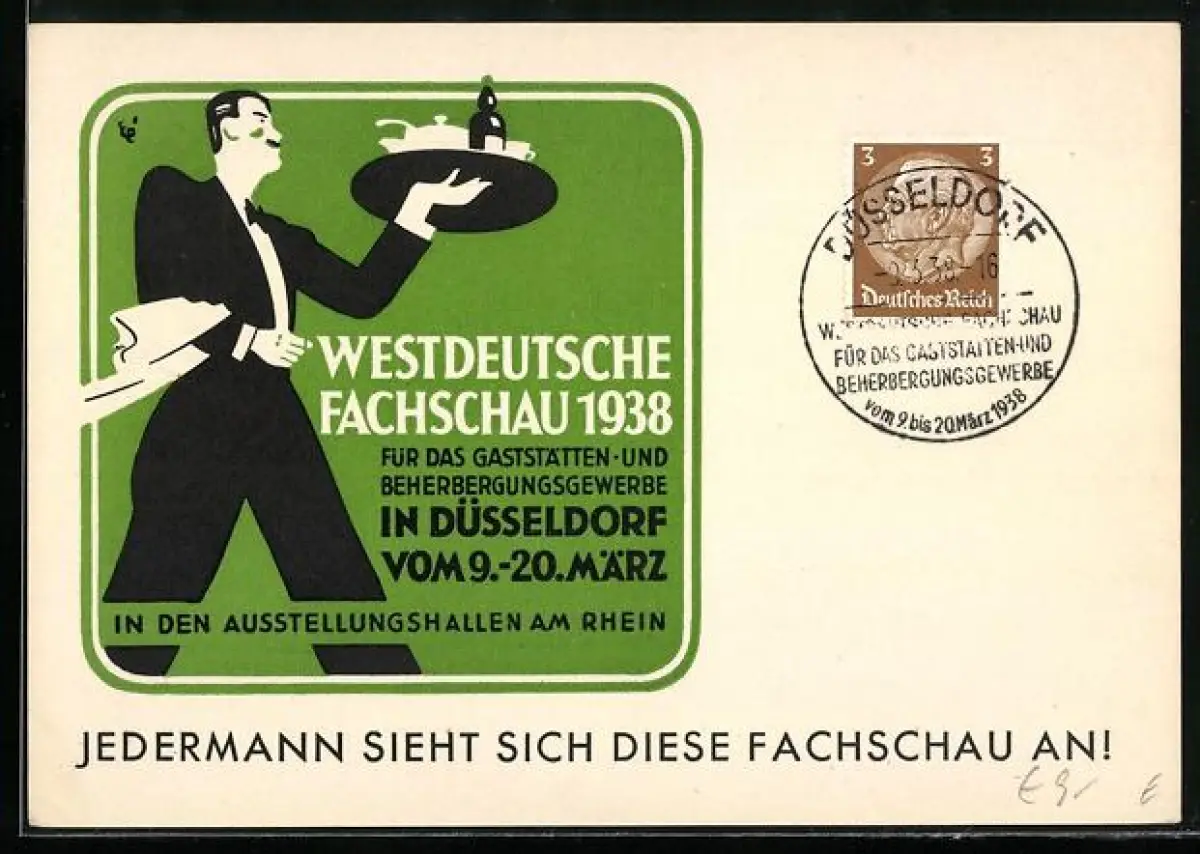 AK Düsseldorf, Westdeutsche Fachschau für das Gaststättengewerbe 1938, Kellner mit Tablett