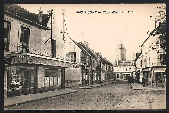 AK Dugny, Place d`Armes avec vue sur la rue animée et bâtiments historiques
