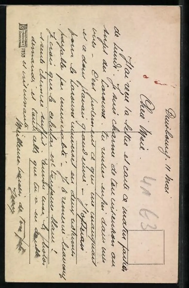 Personenbezogene Daten auf der Rückseite der Karte wurden durch blauen Textmarker unkenntlich gemacht. Die blauen Stellen sind auf die Vorderseite durchgeweicht und wirken sich negativ auf das Postkartenfoto aus