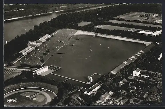 AK Duisburg, Strandbad Wedau mit Regattabahn, Fliegeraufnahme