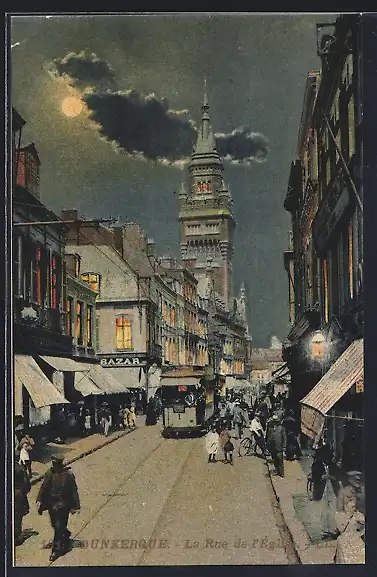AK Dunkerque, La Rue de l`Eglise, Strassenbahn