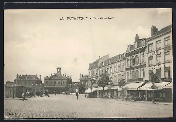 AK Dunkerque, Place de la Gare avec bâtiments et passants