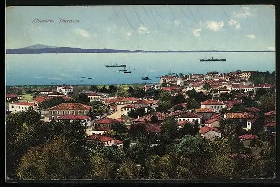 AK Durazzo, Totalansicht aus der Vogelschau mit Blick auf den See