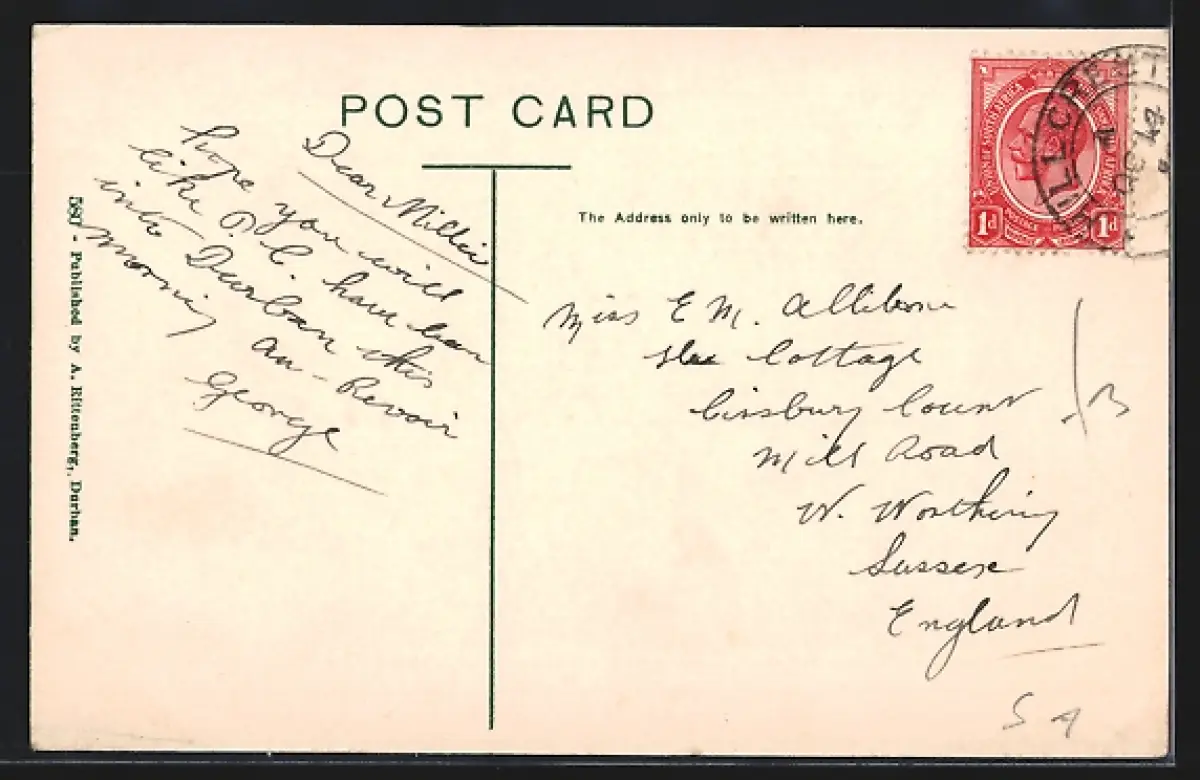 Personenbezogene Daten auf der Rückseite der Karte wurden durch blauen Textmarker unkenntlich gemacht. Die blauen Stellen sind auf die Vorderseite durchgeweicht und wirken sich negativ auf das Postkartenfoto aus