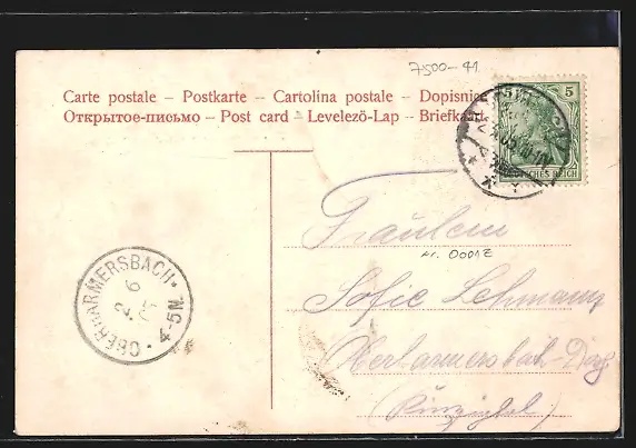 Personenbezogene Daten auf der Rückseite der Karte wurden durch blauen Textmarker unkenntlich gemacht. Die blauen Stellen sind auf die Vorderseite durchgeweicht und wirken sich negativ auf das Postkartenfoto aus
