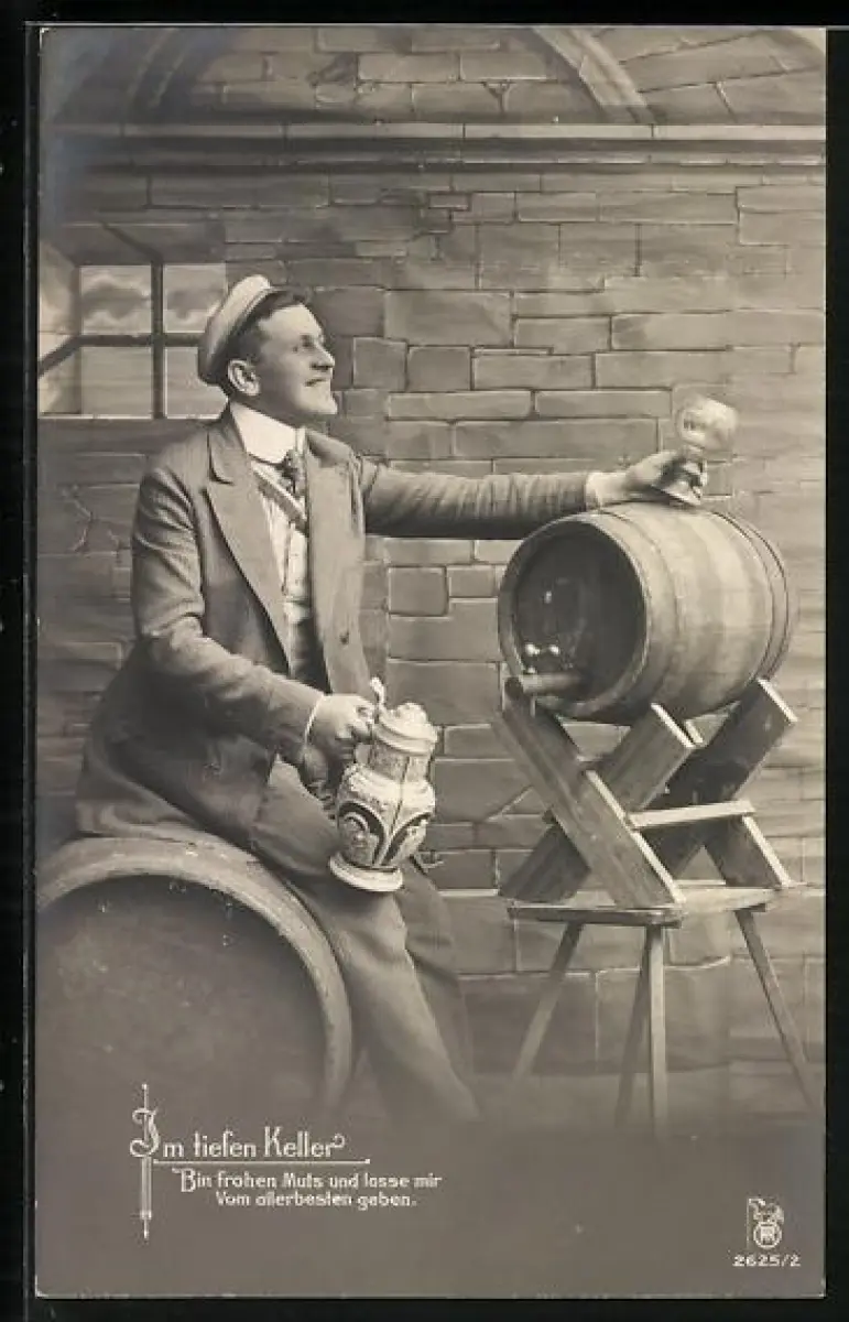 AK Durstiger Student mit Krug u. Weinglas, Im tiefen Keller