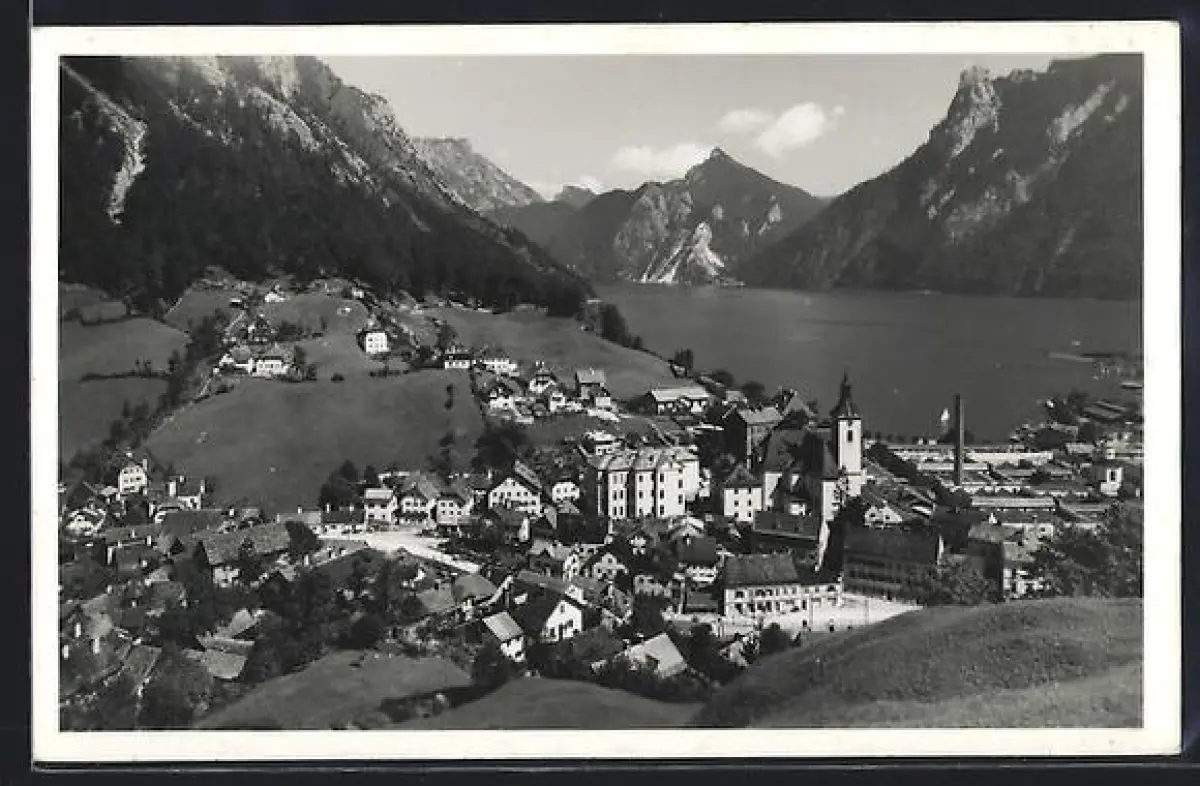 AK Ebensee, Gesamtansicht mit Erlakogel aus der Vogelschau