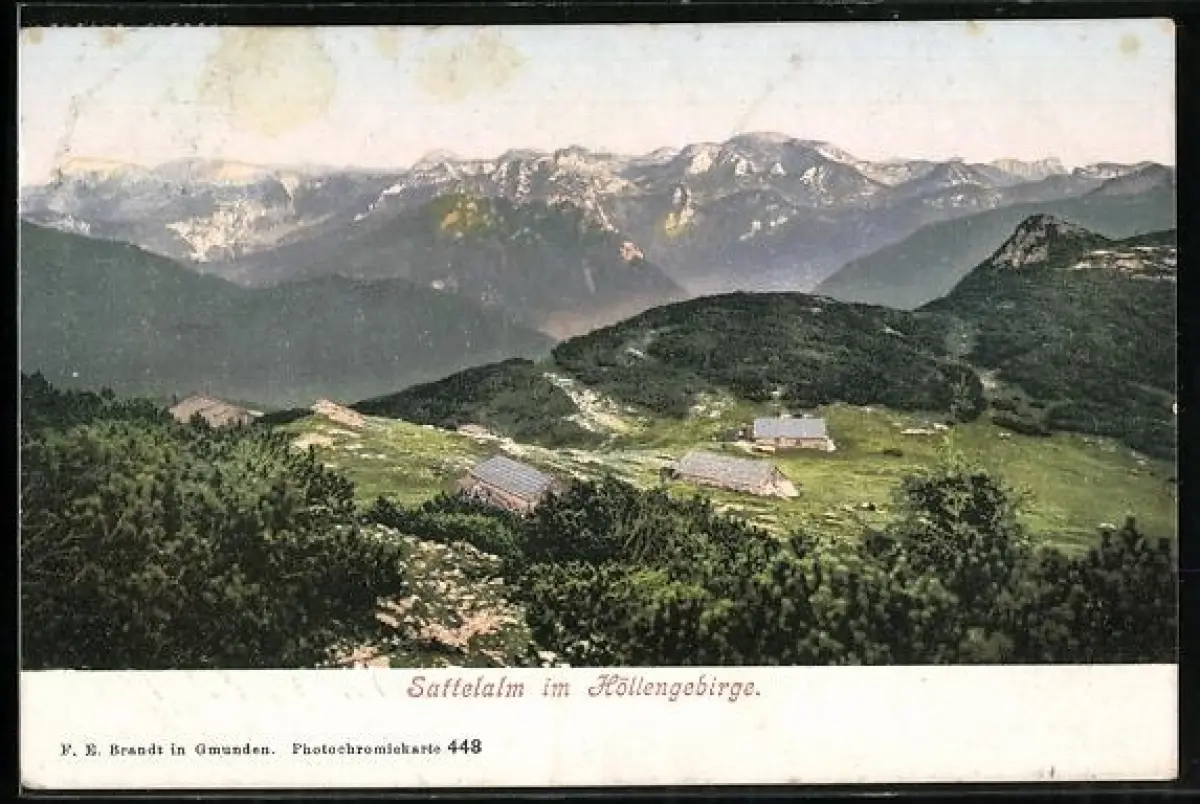 AK Ebensee, Sattelalm im Höllengebirge aus der Vogelschau