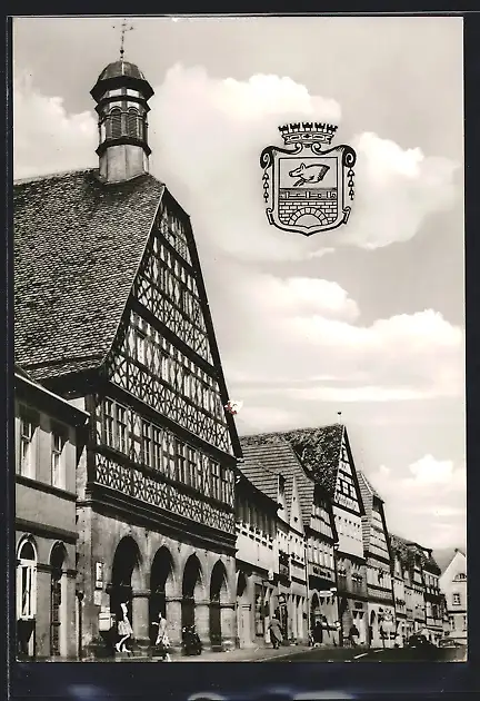 AK Ebern, Rathaus mit Marktplatz, Wappen