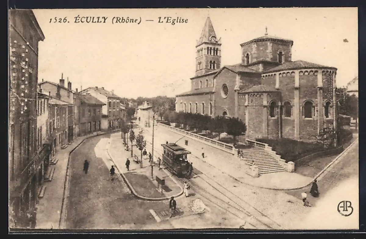 AK Écully /Rhône, L`Eglise avec tramway passant dans la rue animée