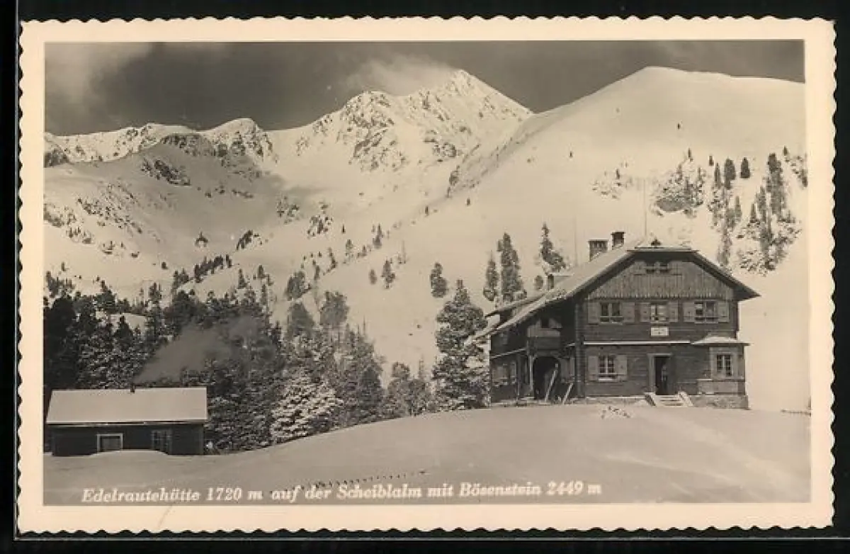 AK Edelrautehütte, Berghütte auf der Scheiblalm mit dem Bösestein im Winter
