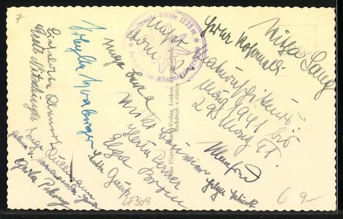 Personenbezogene Daten auf der Rückseite der Karte wurden durch blauen Textmarker unkenntlich gemacht. Die blauen Stellen sind auf die Vorderseite durchgeweicht und wirken sich negativ auf das Postkartenfoto aus