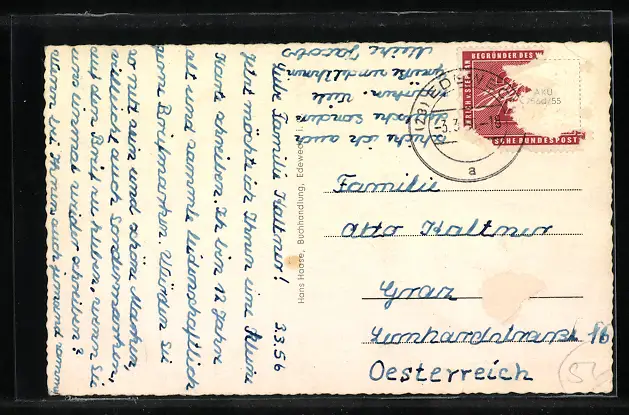 alte Ansichtskarte, gelaufen 1956, Briefmarke entfernt, rückseitig Oberflächenschaden, Eckknicke li., guter Zustand