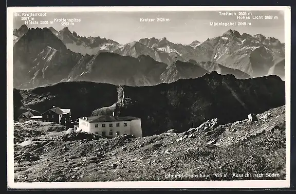 AK Edmund Probst-Haus, Aussicht nach Süden auf Krottenspitze, Kratzer, Trettach, Hohes Licht u. Mädelegabel