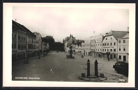 AK Eferding /Oberdonau, Strassenpartie mit Geschäften und Denkmal