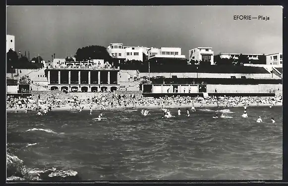 AK Eforie, Strand mit modernen Bauten vom Wasser aus