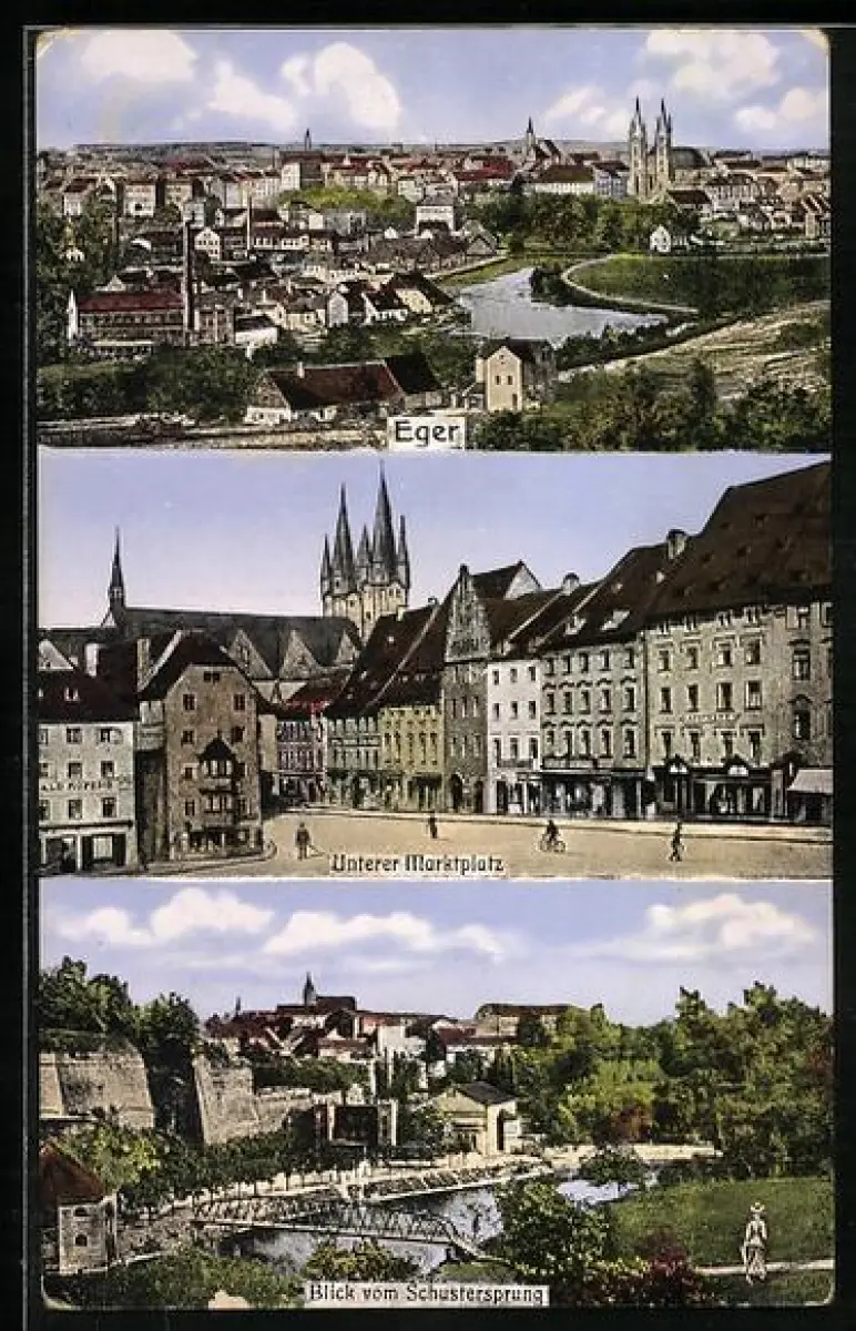 AK Eger, Ortsansicht, Unterer Marktplatz mit Apotheke, Blick vom Schustersprung