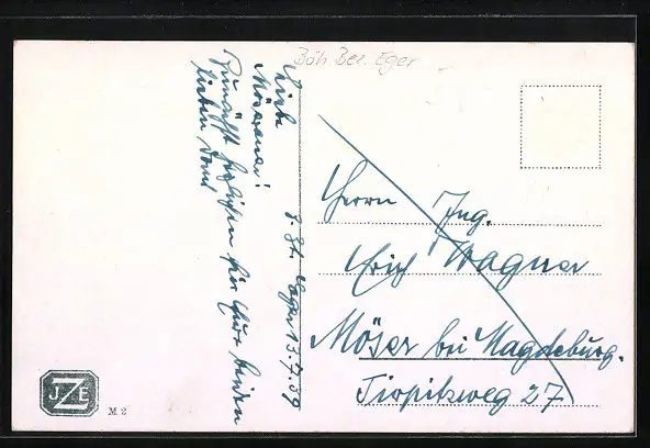 Personenbezogene Daten auf der Rückseite der Karte wurden durch blauen Textmarker unkenntlich gemacht. Die blauen Stellen sind auf die Vorderseite durchgeweicht und wirken sich negativ auf das Postkartenfoto aus