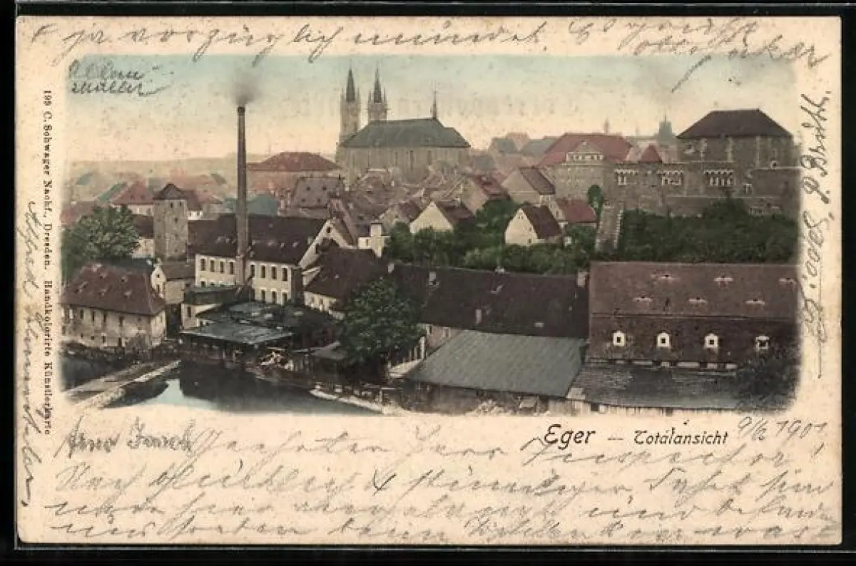 AK Eger, Totalansicht mit Fabrik u. Kirche