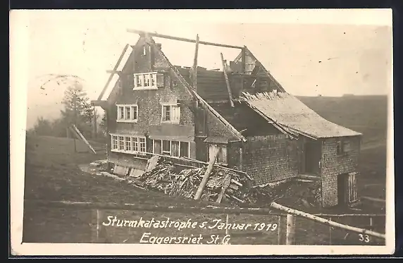 AK Eggersriet, Durch die Sturmkatastrophe am 5. Januar 1919 zerstörtes Haus mit abgedecktem Dach