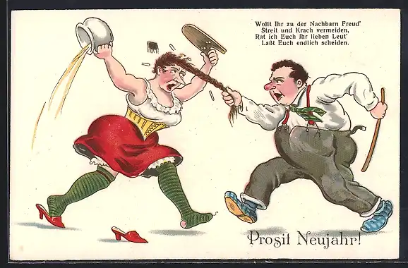 AK Ehepaar bei der körperlichen Auseinandersetzung, frauenfeindlicher Humor