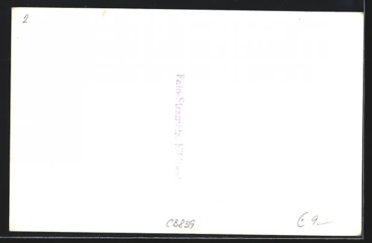Personenbezogene Daten auf der Rückseite der Karte wurden durch blauen Textmarker unkenntlich gemacht. Die blauen Stellen sind auf die Vorderseite durchgeweicht und wirken sich negativ auf das Postkartenfoto aus