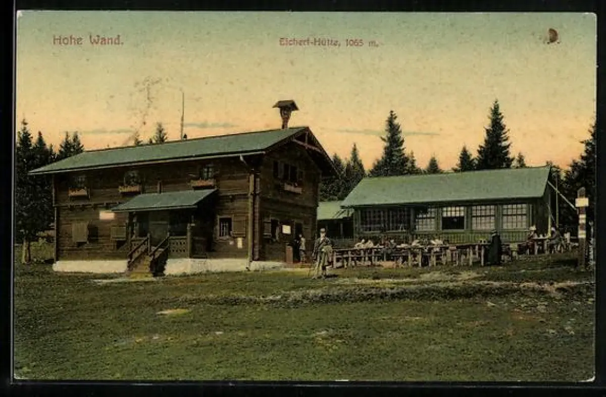 AK Eichert-Hütte, Wanderer vor der Hütte