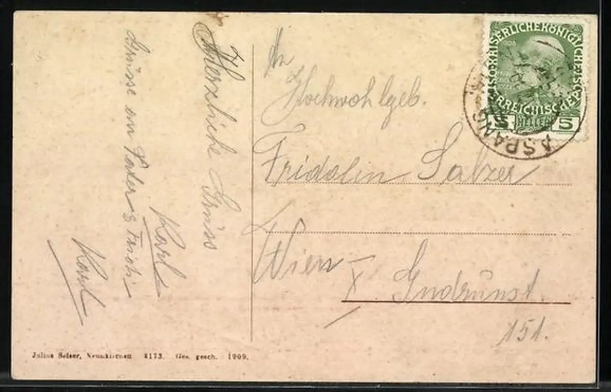 Personenbezogene Daten auf der Rückseite der Karte wurden durch blauen Textmarker unkenntlich gemacht. Die blauen Stellen sind auf die Vorderseite durchgeweicht und wirken sich negativ auf das Postkartenfoto aus