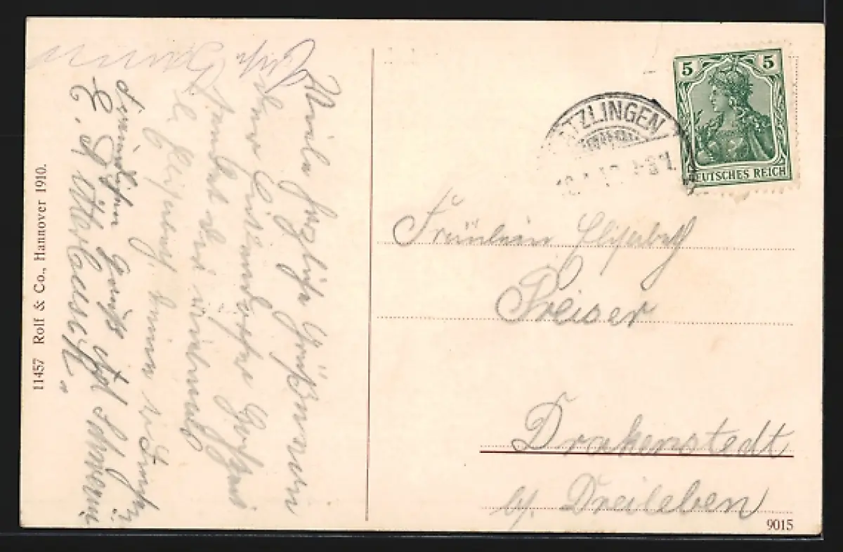 Personenbezogene Daten auf der Rückseite der Karte wurden durch blauen Textmarker unkenntlich gemacht. Die blauen Stellen sind auf die Vorderseite durchgeweicht und wirken sich negativ auf das Postkartenfoto aus