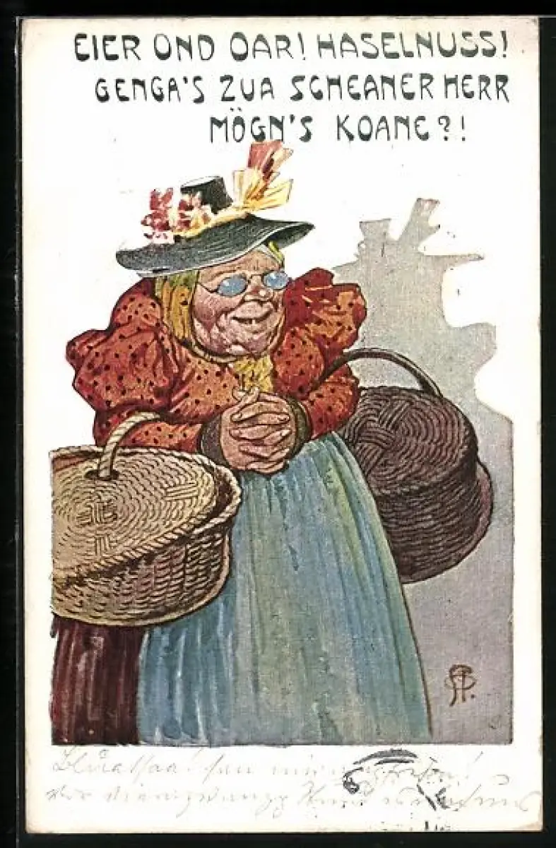 AK Eier ond Oar! Haselnuss! Genga`s zua scheaner Herr mögn`s koane?!, Alte Bäuerin auf dem Weg zum Markt