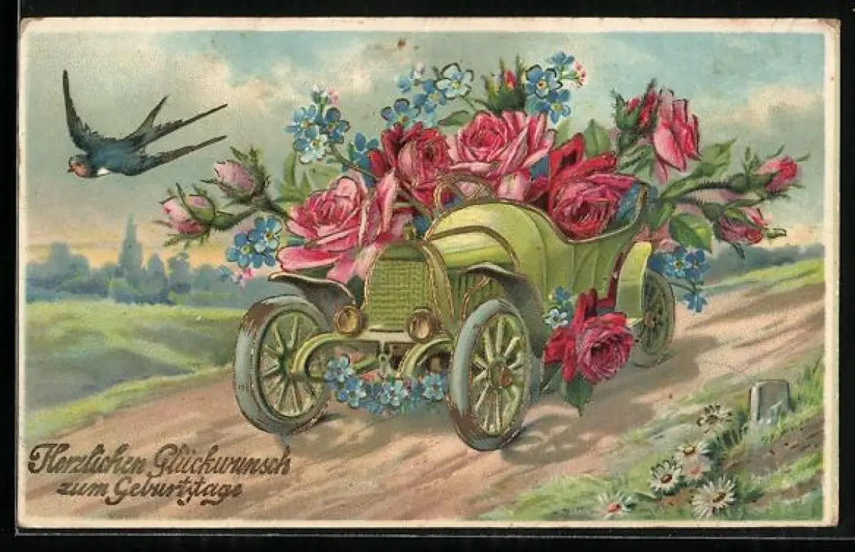AK Ein Auto vollbepackt mit Rosen fährt eine Strasse entlang