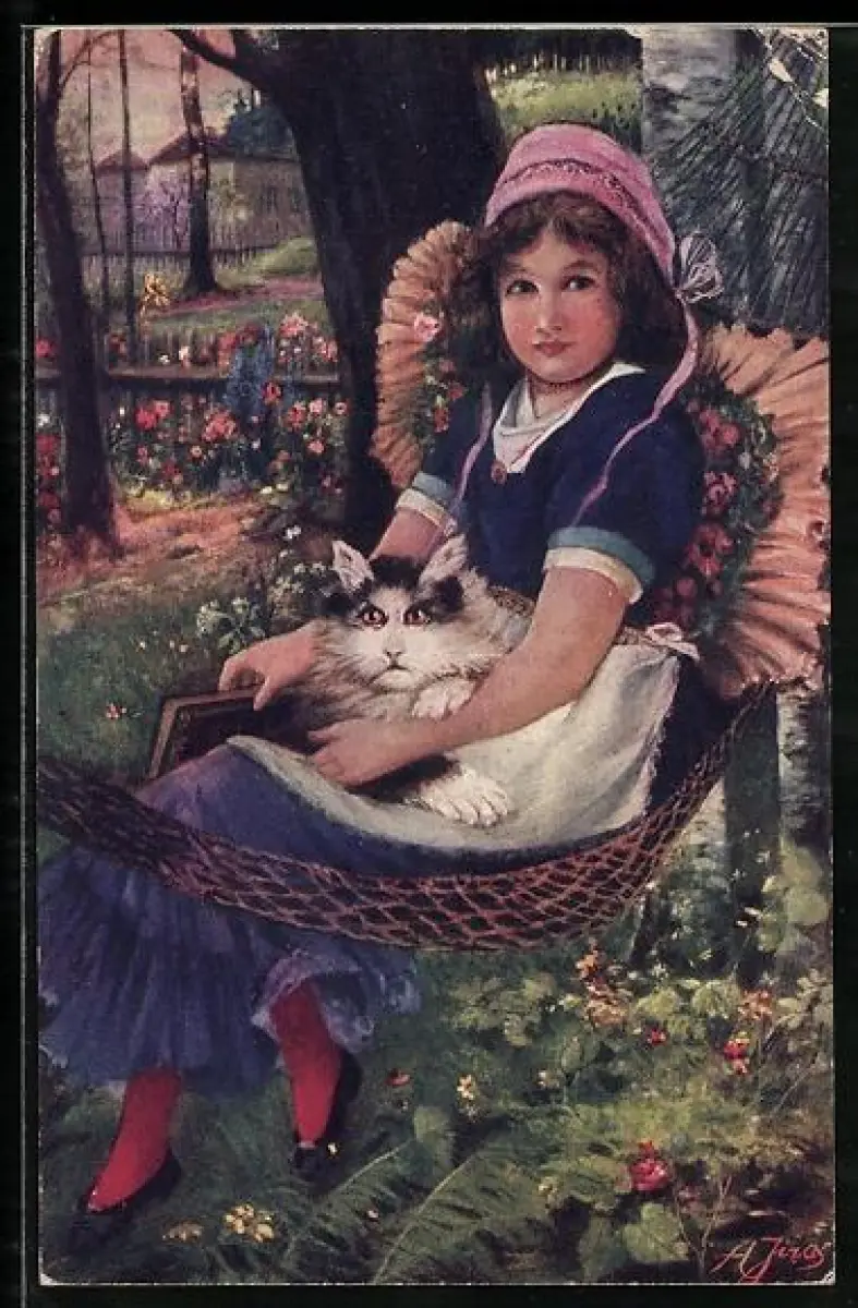 AK Ein Mädchen kuschelt mit ihrer Katze