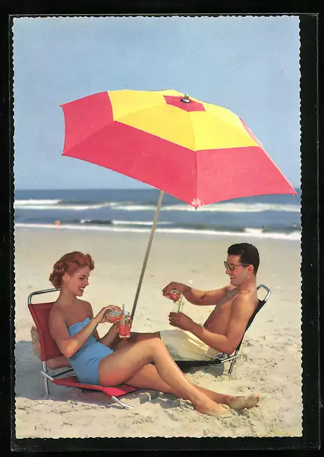 AK Ein Paar in Bademode genehmigt sich unterm Sonnenschirm ein kühles Getränk