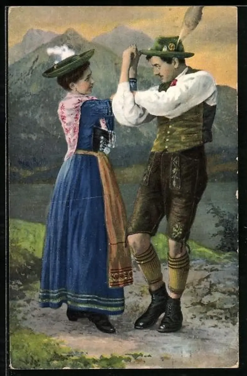AK Ein Pärchen beim Schuhplattler in bayrischen Trachten