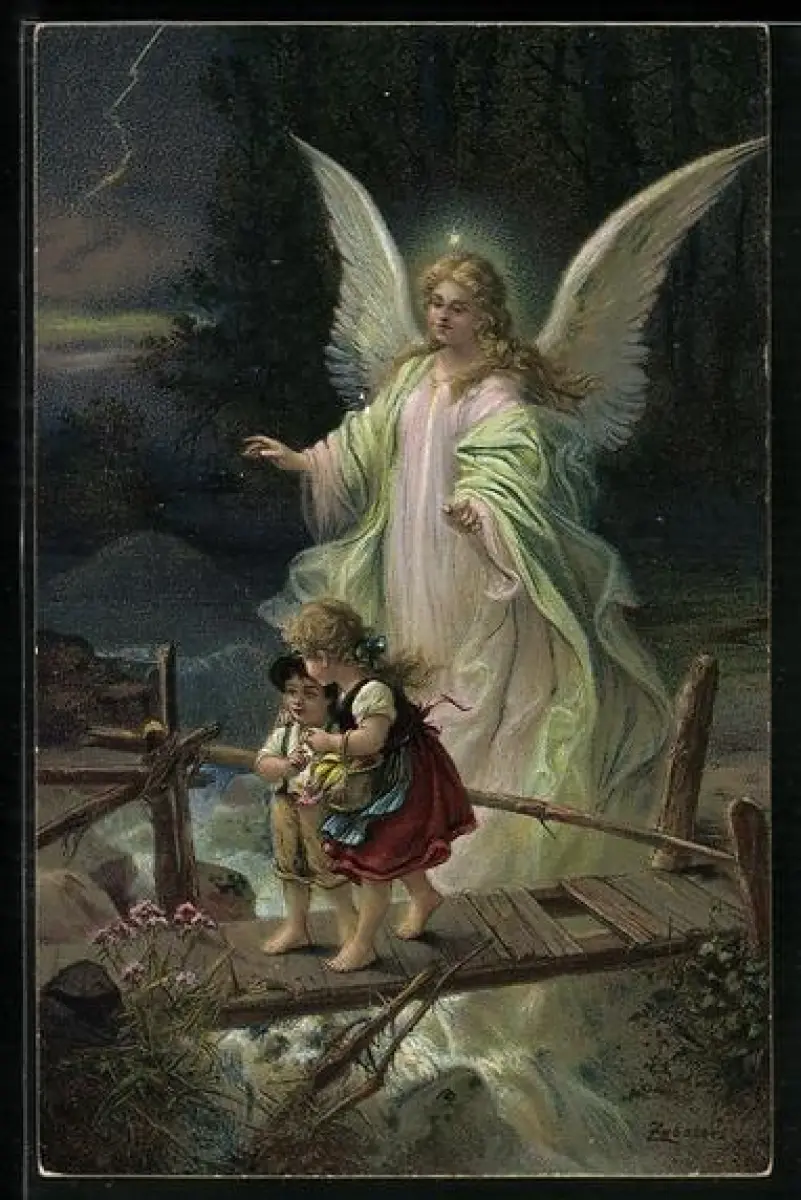 AK Ein Schutzengel behütet ein Mädchen und einen Jungen in der Nacht